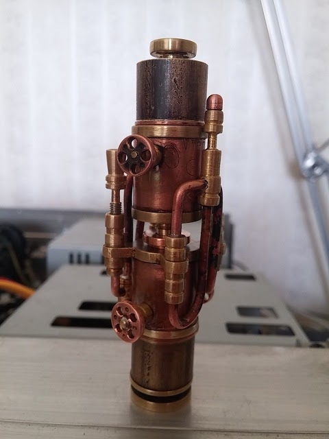 Copper tube was used for the main case, then a part of water supply tube coupling, some brass spacers for decorating. Copper wire, copper 2 mm thickness. All parts were soldered with soft solder.
